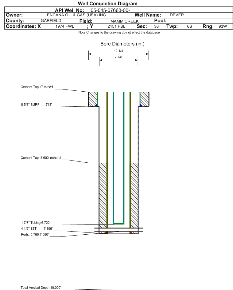 | Wellbore Completed | | Completion Date: | 7/7/2001 | | Spud Date: | 4/19/2001 | Spud Date Is: | ACTUAL | | Measured TD: | 7195 ft. | Measured PB depth: | 7155 ft. | | True Vertical TD: | | True Vertical PB depth: | | | Log Types: | CBL/GR/CCL/RST/GR/CCL | | Casing: | String Type: SURF, Hole Size: 12.25 in., Size: 8.625 in., Top: 0 ft., Depth: 713 ft., Weight: 24 , Citings Type: ACTUAL | | Cement: | Sacks: 360, Top: 0 ft., Bottom: 713 ft., Determination Method: CALC | | Casing: | String Type: 1ST, Hole Size: 7.875 in., Size: 4.5 in., Top: 0 ft., Depth: 7196 ft., Weight: 11.6 , Citings Type: ACTUAL | | Cement: | Sacks: 900, Top: 3600 ft., Bottom: 7196 ft., Determination Method: CBL | | Formation | Interval Top | Log Bottom | Cored | DSTs | | WILLIAMS FORK | 4650 ft. | | N | N |