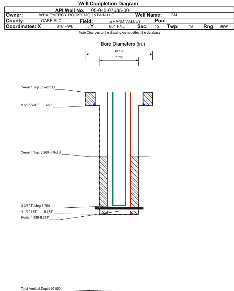 Wellbore #00 Wellbore Classification: GW Status: PR - 8/1/2024 Measured TD: 6185 ft.| Wellbore Data for Original Wellbore | Wellbore Classification: GW PR - 8/1/2024 | | Wellbore Permit | | | Permit #: | 010161 | Expiration Date: | 1/25/2002 | | Proposed Depth/Form: | 6250 ft. | | Surface Mineral Owner Same: | Yes | | Mineral Owner: | FEE | Surface Owner: | FEE | | Unit: | | Unit Number: | | | Formation And Spacing: | Code: WMFK , Formation: WILLIAMS FORK , Order: 479-2 , Unit Acreage: 320, Drill Unit: W2 |