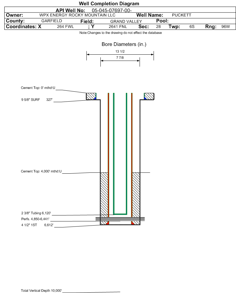 Wellbore #00 Wellbore Classification: GW Status: PR - 1/11/2001 Measured TD: 6622 ft.| Wellbore Data for Original Wellbore | Wellbore Classification: GW PR - 1/11/2001 | | Wellbore Permit | | | Permit #: | 010212 | Expiration Date: | 2/4/2002 | | Proposed Depth/Form: | 6900 ft. | | Surface Mineral Owner Same: | Yes | | Mineral Owner: | FEE | Surface Owner: | FEE | | Unit: | | Unit Number: | | | Formation And Spacing: | Code: WMFK , Formation: WILLIAMS FORK , Order: 479-7 , Unit Acreage: 320, Drill Unit: W2 |