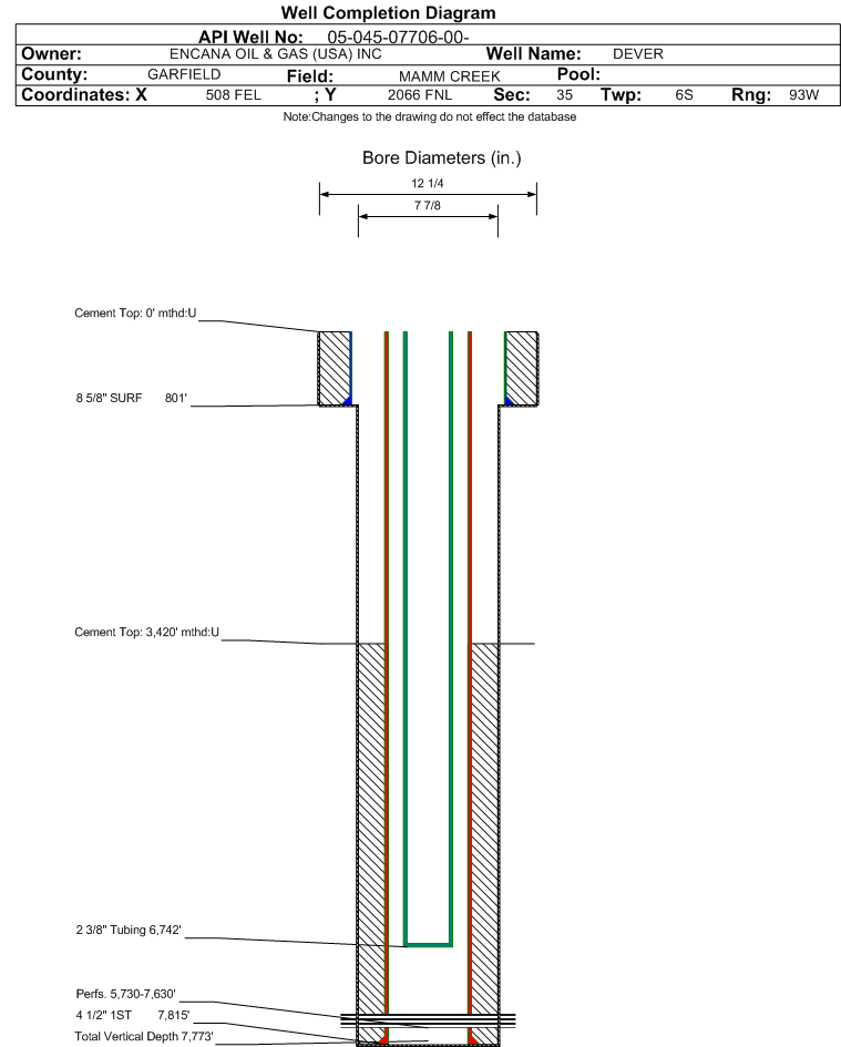 | Wellbore Completed | | Completion Date: | 2/9/2002 | | Spud Date: | 6/14/2001 | Spud Date Is: | ACTUAL | | Measured TD: | 7773 ft. | Measured PB depth: | 7773 ft. | | True Vertical TD: | 7773 ft. | True Vertical PB depth: | 7773 ft. | | Top PZ Location: | Sec: Twp: | Footage: 2120 FSL 482 FWL | | Bottom Hole Location: | Sec: Twp: | Footage: 1795 FSL 709 FWL | | Log Types: | RST / CG / CCL / CBL | | Casing: | String Type: SURF, Hole Size: 12.25 in., Size: 8.625 in., Top: 0 ft., Depth: 801 ft., Weight: 24 , Citings Type: ACTUAL | | Cement: | Sacks: 360, Top: 0 ft., Bottom: 801 ft., Determination Method: CALC | | Casing: | String Type: 1ST, Hole Size: 7.875 in., Size: 4.5 in., Top: 0 ft., Depth: 7815 ft., Weight: 11.6 , Citings Type: ACTUAL | | Cement: | Sacks: 1000, Top: 3420 ft., Bottom: 7815 ft., Determination Method: CBL | | Formation | Interval Top | Log Bottom | Cored | DSTs | | WILLIAMS FORK | 3908 ft. | | N | N |
