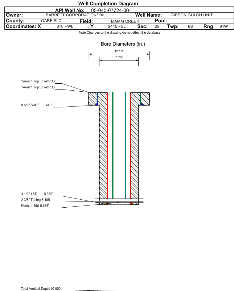 Wellbore #00 Wellbore Classification: GW Status: PR - 9/1/2004 Measured TD: | Wellbore Data for Original Wellbore | Wellbore Classification: GW PR - 9/1/2004 | | Wellbore Permit | | | Permit #: | 010363 | Expiration Date: | 2/25/2002 | | Proposed Depth/Form: | 5400 ft. | | Surface Mineral Owner Same: | No | | Mineral Owner: | FEE | Surface Owner: | FEE | | Unit: | GIBSON GULCH | Unit Number: | | | Formation And Spacing: | Code: WMFK , Formation: WILLIAMS FORK , Order: , Unit Acreage: , Drill Unit: |