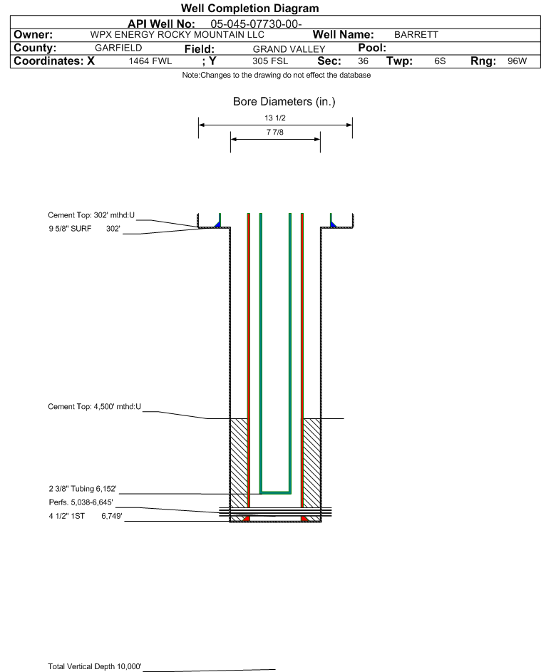 Wellbore #00 Wellbore Classification: GW Status: PR - 2/7/2001 Measured TD: 6750 ft.| Wellbore Data for Original Wellbore | Wellbore Classification: GW PR - 2/7/2001 | | Wellbore Permit | | | Permit #: | 010435 | Expiration Date: | 3/5/2002 | | Proposed Depth/Form: | 7030 ft. | | Surface Mineral Owner Same: | Yes | | Mineral Owner: | FEE | Surface Owner: | FEE | | Unit: | | Unit Number: | | | Formation And Spacing: | Code: WMFK , Formation: WILLIAMS FORK , Order: 139-32 , Unit Acreage: 160, Drill Unit: SW4 |