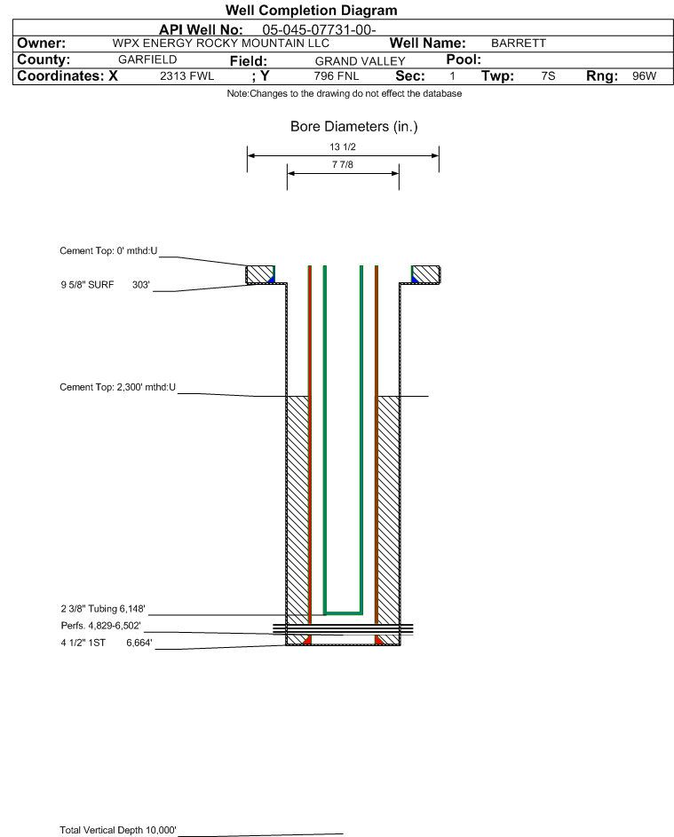 Wellbore #00 Wellbore Classification: GW Status: PR - 2/6/2001 Measured TD: 6670 ft.| Wellbore Data for Original Wellbore | Wellbore Classification: GW PR - 2/6/2001 | | Wellbore Permit | | | Permit #: | 010436 | Expiration Date: | 3/5/2002 | | Proposed Depth/Form: | 7000 ft. | | Surface Mineral Owner Same: | Yes | | Mineral Owner: | FEE | Surface Owner: | FEE | | Unit: | | Unit Number: | | | Formation And Spacing: | Code: WMFK , Formation: WILLIAMS FORK , Order: 510-3 , Unit Acreage: 320, Drill Unit: N2 |