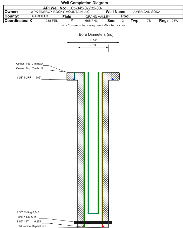 Wellbore #00 Wellbore Classification: GW Status: PR - 2/8/2001 Measured TD: Vertical TD: 6275 ft.| Wellbore Data for Original Wellbore | Wellbore Classification: GW PR - 2/8/2001 | | Wellbore Permit | | | Permit #: | 010437 | Expiration Date: | 3/5/2002 | | Proposed Depth/Form: | 6640 ft. | | Surface Mineral Owner Same: | No | | Mineral Owner: | FEE | Surface Owner: | FEE | | Unit: | | Unit Number: | | | Formation And Spacing: | Code: WMFK , Formation: WILLIAMS FORK , Order: 495-2, 139, Unit Acreage: 320, Drill Unit: N2 |