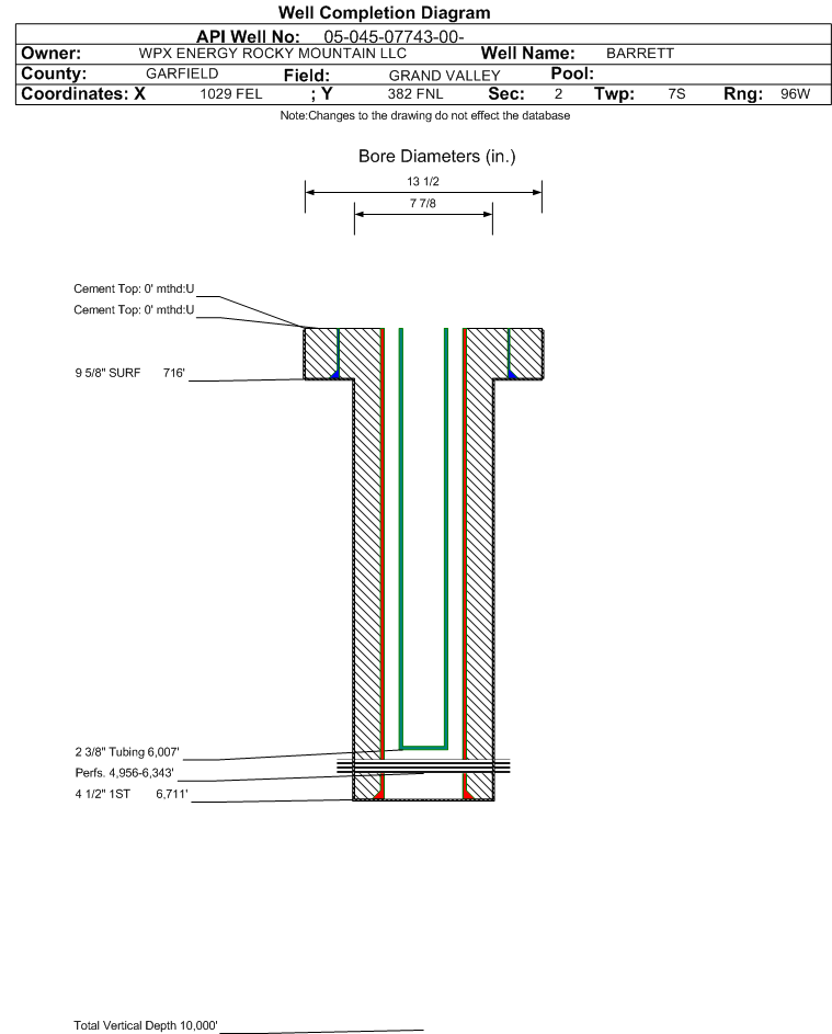 Wellbore #00 Wellbore Classification: GW Status: SI - 10/1/2020 Measured TD: 6715 ft.| Wellbore Data for Original Wellbore | Wellbore Classification: GW SI - 10/1/2020 | | Wellbore Permit | | | Permit #: | 010491 | Expiration Date: | 3/18/2002 | | Proposed Depth/Form: | 7060 ft. | | Surface Mineral Owner Same: | Yes | | Mineral Owner: | FEE | Surface Owner: | FEE | | Unit: | | Unit Number: | | | Formation And Spacing: | Code: WMFK , Formation: WILLIAMS FORK , Order: 510-3 , Unit Acreage: 160, Drill Unit: NE4 |