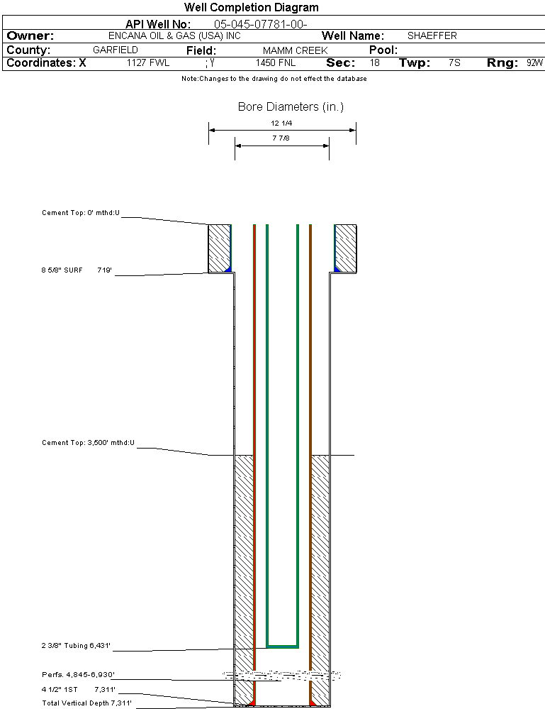 | Wellbore Completed | | Completion Date: | 1/9/2001 | | Spud Date: | 5/11/2001 | Spud Date Is: | ACTUAL | | Measured TD: | 7311 ft. | Measured PB depth: | | | True Vertical TD: | | True Vertical PB depth: | 7244 ft. | | Top PZ Location: | Sec: Twp: | Footage: 2001 FNL 1467 FWL | | Bottom Hole Location: | Sec: Twp: | Footage: 2148 FNL 1689 FWL | | Log Types: | CML/GR/CCL, RST/GR/CCL | | Casing: | String Type: SURF, Hole Size: 12.25 in., Size: 8.625 in., Top: 0 ft., Depth: 719 ft., Weight: 32 , Citings Type: ACTUAL | | Cement: | Sacks: 360, Top: 0 ft., Bottom: 719 ft., Determination Method: CALC | | Casing: | String Type: 1ST, Hole Size: 7.875 in., Size: 4.5 in., Top: 0 ft., Depth: 7311 ft., Weight: 11.6 , Citings Type: ACTUAL | | Cement: | Sacks: 1000, Top: 3500 ft., Bottom: 7311 ft., Determination Method: CBL | | Formation | Interval Top | Log Bottom | Cored | DSTs | | WASATCH | 0 ft. | 3999 ft. | N | N | | WILLIAMS FORK | 4000 ft. | 7053 ft. | N | N | | ROLLINS | 7054 ft. | 7311 ft. | N | N |