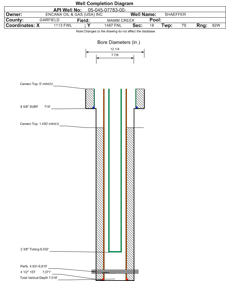 | Wellbore Completed | | Completion Date: | 1/5/2002 | | Spud Date: | 5/11/2001 | Spud Date Is: | ACTUAL | | Measured TD: | 7077 ft. | Measured PB depth: | | | True Vertical TD: | 7018 ft. | True Vertical PB depth: | 6917 ft. | | Top PZ Location: | Sec: Twp: | Footage: 1115 FNL 1522 FWL | | Bottom Hole Location: | Sec: Twp: | Footage: 1063 FNL 1789 FWL | | Log Types: | CML/GR/CCL, RST/GR/CCL | | Casing: | String Type: SURF, Hole Size: 12.25 in., Size: 8.625 in., Top: 0 ft., Depth: 719 ft., Weight: 32 , Citings Type: ACTUAL | | Cement: | Sacks: 360, Top: 0 ft., Bottom: 719 ft., Determination Method: CALC | | Casing: | String Type: 1ST, Hole Size: 7.875 in., Size: 4.5 in., Top: 0 ft., Depth: 7071 ft., Weight: 11.6 , Citings Type: ACTUAL | | Cement: | Sacks: 1440, Top: 1430 ft., Bottom: 7071 ft., Determination Method: CBL | | Formation | Interval Top | Log Bottom | Cored | DSTs | | WASATCH | 0 ft. | 3960 ft. | N | N | | WILLIAMS FORK | 3961 ft. | 7077 ft. | N | N |