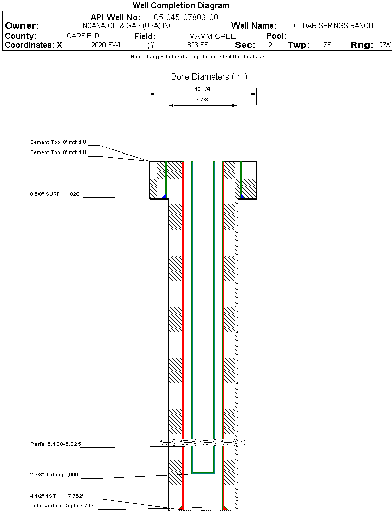 Wellbore #00 Wellbore Classification: GW Status: PR - 1/20/2005 Measured TD: 7775 ft. Vertical TD: 7713 ft.| Wellbore Data for Original Wellbore | Wellbore Classification: GW PR - 1/20/2005 | | Wellbore Permit | | | Permit #: | 010822 | Expiration Date: | 4/29/2002 | | Proposed Top PZ Location: | Sec:2 Twp: 7S 93W | Footage: 1339 FSL 2616 FWL | | Bottom Hole Location: | Sec:2 Twp: 7S 93W | Footage: 1339 FSL 2616 FWL | | Proposed Depth/Form: | 7680 ft. | | Surface Mineral Owner Same: | Yes | | Mineral Owner: | FEE | Surface Owner: | FEE | | Unit: | | Unit Number: | | | Formation And Spacing: | Code: WMFK , Formation: WILLIAMS FORK , Order: , Unit Acreage: , Drill Unit: |