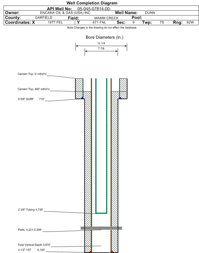 | Wellbore Completed | | Completion Date: | 3/1/2002 | | Spud Date: | 8/18/2001 | Spud Date Is: | ACTUAL | | Measured TD: | 5870 ft. | Measured PB depth: | 5870 ft. | | True Vertical TD: | 5870 ft. | True Vertical PB depth: | | | Top PZ Location: | Sec: Twp: | Footage: 1814 FNL 1928 FEL | | Bottom Hole Location: | Sec: Twp: | Footage: 2030 FNL 1967 FEL | | Log Types: | SCMT/GR/CCL/RSL/CBL | | Casing: | String Type: SURF, Hole Size: 12.25 in., Size: 8.625 in., Top: 0 ft., Depth: 710 ft., Weight: 24 , Citings Type: ACTUAL | | Cement: | Sacks: 375, Top: 0 ft., Bottom: 710 ft., Determination Method: CALC | | Casing: | String Type: 1ST, Hole Size: 7.875 in., Size: 4.5 in., Top: 0 ft., Depth: 6100 ft., Weight: 11.6 , Citings Type: ACTUAL | | Cement: | Sacks: 1060, Top: 460 ft., Bottom: 6100 ft., Determination Method: CBL | | Formation | Interval Top | Log Bottom | Cored | DSTs | | WILLIAMS FORK | 2526 ft. | | N | N |