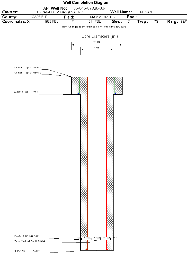 | Wellbore Completed | | Completion Date: | 5/6/2002 | | Spud Date: | 8/7/2001 | Spud Date Is: | ACTUAL | | Measured TD: | 7210 ft. | Measured PB depth: | 7198 ft. | | True Vertical TD: | 6914 ft. | True Vertical PB depth: | | | Top PZ Location: | Sec: Twp: | Footage: 919 FNL 1517 FEL | | Bottom Hole Location: | Sec: Twp: | Footage: 1148 FNL 1397 FEL | | Log Types: | C B L / GR / CCL | | Casing: | String Type: SURF, Hole Size: 12.25 in., Size: 8.625 in., Top: 0 ft., Depth: 732 ft., Weight: 24 , Citings Type: ACTUAL | | Cement: | Sacks: 400, Top: 0 ft., Bottom: 732 ft., Determination Method: CALC | | Casing: | String Type: 1ST, Hole Size: 7.875 in., Size: 4.5 in., Top: 0 ft., Depth: 7264 ft., Weight: 11.6 , Citings Type: ACTUAL | | Cement: | Sacks: 1075, Top: 0 ft., Bottom: 7264 ft., Determination Method: CBL | | Formation | Interval Top | Log Bottom | Cored | DSTs | | WASATCH | 0 ft. | 3310 ft. | N | N | | WILLIAMS FK-ROLLINS-CAMEO | 3911 ft. | 7055 ft. | N | N | | ROLLINS | 7056 ft. | 7210 ft. | N | N |