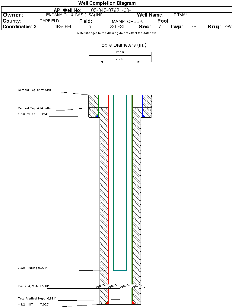 Formation WMFK Formation Classification: GW Status: PR - 2/16/2006 Interval Top: 4734 ft. Interval Bottom: 6508 ft.| Completed Information for Formation WILLIAMS FORK | | 1st Production Date: | 5/11/2002 | Choke Size: | 0.370 in. | | Formation Name: | WILLIAMS FORK | Commingled: | No | | Production Method: | FLOWING | | Open Hole Completion: | |