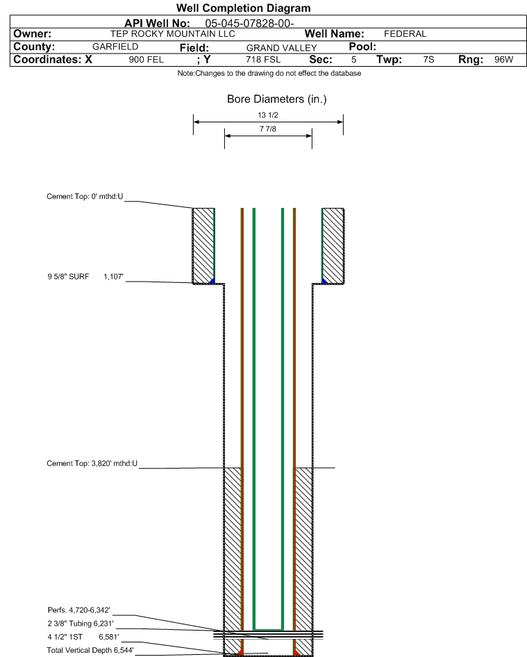 Wellbore #00 Wellbore Classification: GW Status: PR - 5/7/2002 Measured TD: 6629 ft. Vertical TD: 6544 ft.| Wellbore Data for Original Wellbore | Wellbore Classification: GW PR - 5/7/2002 | | Wellbore Permit | | | Permit #: | 011031 | Expiration Date: | 5/22/2002 | | Proposed Top PZ Location: | Sec:5 Twp: 7S 96W | Footage: 1383 FSL 1291 FEL | | Bottom Hole Location: | Sec:5 Twp: 7S 96W | Footage: 1435 FSL 1350 FEL | | Proposed Depth/Form: | 6500 ft. | | Surface Mineral Owner Same: | Yes | | Mineral Owner: | FEDERAL | Surface Owner: | FEDERAL | | Unit: | | Unit Number: | | | Formation And Spacing: | Code: WMFK , Formation: WILLIAMS FORK , Order: 139-35 , Unit Acreage: 160, Drill Unit: SW4 | | Casing: | String Type: CONDUCTOR, Hole Size: , Size: 16 in., Top: , Depth: 45 ft., Weight: , Citings Type: PLANNED | | Cement: | Sacks: , Top: , Bottom: |