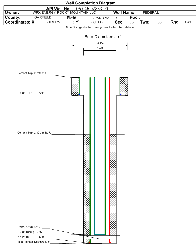 Wellbore #00 Wellbore Classification: GW Status: PR - 6/26/2002 Measured TD: 6717 ft. Vertical TD: 6675 ft.| Wellbore Data for Original Wellbore | Wellbore Classification: GW PR - 6/26/2002 | | Wellbore Permit | | | Permit #: | 011037 | Expiration Date: | 5/24/2002 | | Proposed Top PZ Location: | Sec:33 Twp: 6S 96W | Footage: 492 FSL 1376 FWL | | Bottom Hole Location: | Sec:33 Twp: 6S 96W | Footage: 440 FSL 1305 FWL | | Proposed Depth/Form: | 6640 ft. | | Surface Mineral Owner Same: | Yes | | Mineral Owner: | FEDERAL | Surface Owner: | FEDERAL | | Unit: | | Unit Number: | | | Formation And Spacing: | Code: WMFK , Formation: WILLIAMS FORK , Order: 139-35 , Unit Acreage: 160, Drill Unit: SW4 | | Casing: | String Type: CONDUCTOR, Hole Size: , Size: 20 in., Top: , Depth: 45 ft., Weight: , Citings Type: PLANNED | | Cement: | Sacks: , Top: , Bottom: |