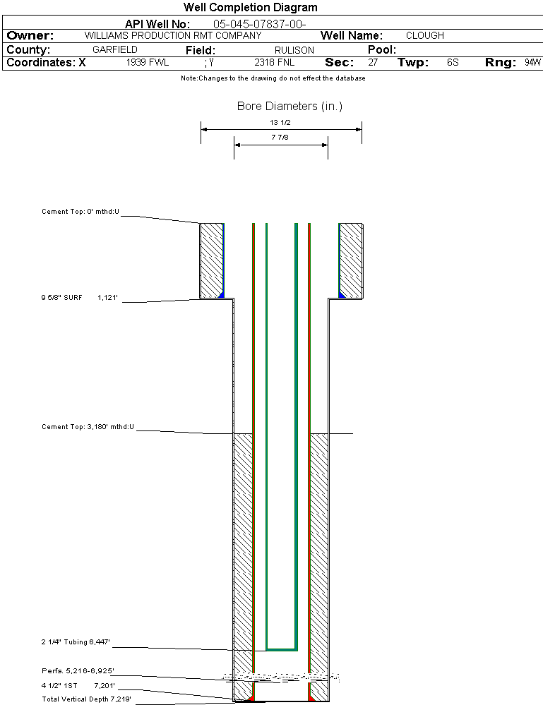 Wellbore #00 Wellbore Classification: GW Status: PR - 6/30/2002 Measured TD: 7219 ft.| Wellbore Data for Original Wellbore | Wellbore Classification: GW PR - 6/30/2002 | | Wellbore Permit | | | Permit #: | 20020732 | Expiration Date: | 4/11/2003 | | Proposed Depth/Form: | 7490 ft. | | Surface Mineral Owner Same: | Yes | | Mineral Owner: | FEE | Surface Owner: | FEE | | Unit: | | Unit Number: | | | Formation And Spacing: | Code: WFCM , Formation: WILLIAMS FORK - CAMEO , Order: 139-33 , Unit Acreage: 320, Drill Unit: W/2 |