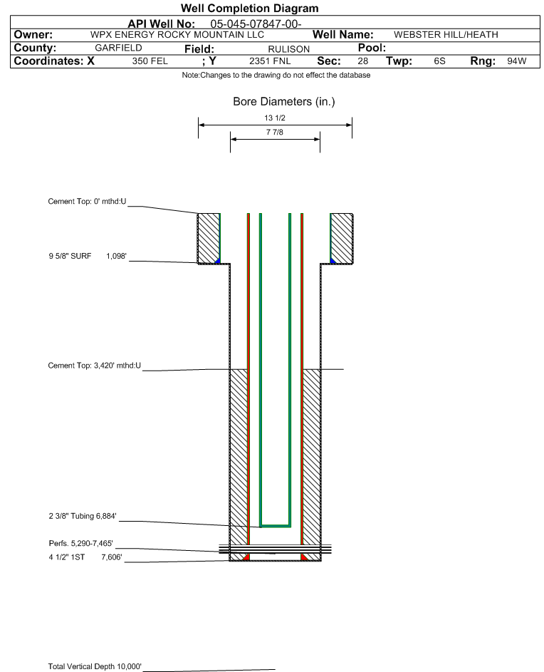 | Wellbore Completed | | Completion Date: | 5/15/2002 | | Spud Date: | 3/16/2002 | Spud Date Is: | ACTUAL | | Measured TD: | 7616 ft. | Measured PB depth: | 7560 ft. | | True Vertical TD: | | True Vertical PB depth: | | | Log Types: | DIL - GR - SP NEUTRON DENSITY | | Casing: | String Type: SURF, Hole Size: 13.5 in., Size: 9.625 in., Top: 0 ft., Depth: 1098 ft., Weight: 36 , Citings Type: ACTUAL | | Cement: | Sacks: 480, Top: , Bottom: 1098 ft., Determination Method: | | Casing: | String Type: 1ST, Hole Size: 7.875 in., Size: 4.5 in., Top: 0 ft., Depth: 7606 ft., Weight: 11.6 , Citings Type: ACTUAL | | Cement: | Sacks: 1250, Top: 3420 ft., Bottom: 7606 ft., Determination Method: | | Formation | Interval Top | Log Bottom | Cored | DSTs | | WASATCH G | 1490 ft. | | N | N | | MESAVERDE | 3922 ft. | | N | N | | CAMEO | 6687 ft. | | N | N | | ROLLINS | 7607 ft. | | N | N |