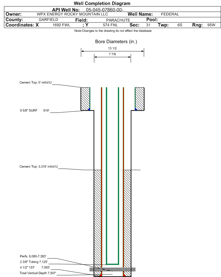 Wellbore #00 Wellbore Classification: GW Status: PR - 6/5/2002 Measured TD: 7596 ft. Vertical TD: 7507 ft.| Wellbore Data for Original Wellbore | Wellbore Classification: GW PR - 6/5/2002 | | Wellbore Permit | | | Permit #: | 011219 | Expiration Date: | 6/21/2002 | | Proposed Top PZ Location: | Sec:31 Twp: 6S 95W | Footage: 1114 FNL 1034 FWL | | Bottom Hole Location: | Sec:31 Twp: 6S 95W | Footage: 1173 FNL 977 FWL | | Proposed Depth/Form: | 7580 ft. | | Surface Mineral Owner Same: | Yes | | Mineral Owner: | FEDERAL | Surface Owner: | FEDERAL | | Unit: | | Unit Number: | | | Formation And Spacing: | Code: WMFK , Formation: WILLIAMS FORK , Order: 479-8 , Unit Acreage: 320, Drill Unit: W2 | | Casing: | String Type: CONDUCTOR, Hole Size: , Size: 16 in., Top: , Depth: 45 ft., Weight: , Citings Type: PLANNED | | Cement: | Sacks: , Top: , Bottom: |