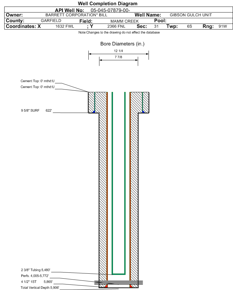 Wellbore #00 Wellbore Classification: GW Status: PR - 7/16/2009 Measured TD: 6108 ft. Vertical TD: 5906 ft.| Wellbore Data for Original Wellbore | Wellbore Classification: GW PR - 7/16/2009 | | Wellbore Permit | | | Permit #: | 011348 | Expiration Date: | 7/10/2002 | | Proposed Top PZ Location: | Sec:31 Twp: 6S 91W | Footage: 2366 FNL 1632 FWL | | Bottom Hole Location: | Sec:31 Twp: 6S 91W | Footage: 2366 FNL 1632 FWL | | Proposed Depth/Form: | 5800 ft. | | Surface Mineral Owner Same: | No | | Mineral Owner: | FEE | Surface Owner: | FEE | | Unit: | GIBSON GULCH | Unit Number: | | | Formation And Spacing: | Code: WMFK , Formation: WILLIAMS FORK , Order: , Unit Acreage: , Drill Unit: |