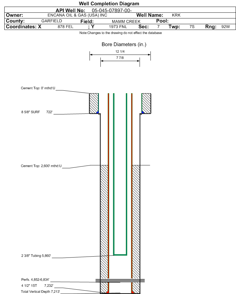 | Wellbore Completed | | Completion Date: | 7/4/2002 | | Spud Date: | 3/8/2002 | Spud Date Is: | ACTUAL | | Measured TD: | 7250 ft. | Measured PB depth: | | | True Vertical TD: | 7213 ft. | True Vertical PB depth: | 7175 ft. | | Top PZ Location: | Sec: Twp: | Footage: 1569 FNL 809 FEL | | Bottom Hole Location: | Sec: Twp: | Footage: 1501 FNL 691 FEL | | Log Types: | CBL/GR/CCL,RSL,CBL,AI/LC/GR,CN/TLD/GR | | Casing: | String Type: SURF, Hole Size: 12.25 in., Size: 8.625 in., Top: 0 ft., Depth: 722 ft., Weight: 24 , Citings Type: ACTUAL | | Cement: | Sacks: 390, Top: 0 ft., Bottom: 772 ft., Determination Method: CALC | | Casing: | String Type: 1ST, Hole Size: 7.875 in., Size: 4.5 in., Top: 0 ft., Depth: 7232 ft., Weight: 11.6 , Citings Type: ACTUAL | | Cement: | Sacks: 1070, Top: 2600 ft., Bottom: 7232 ft., Determination Method: CBL | | Formation | Interval Top | Log Bottom | Cored | DSTs | | WASATCH | 0 ft. | 3618 ft. | N | N | | WILLIAMS FORK | 3619 ft. | 6774 ft. | N | N | | ROLLINS | 6775 ft. | 7250 ft. | N | N |