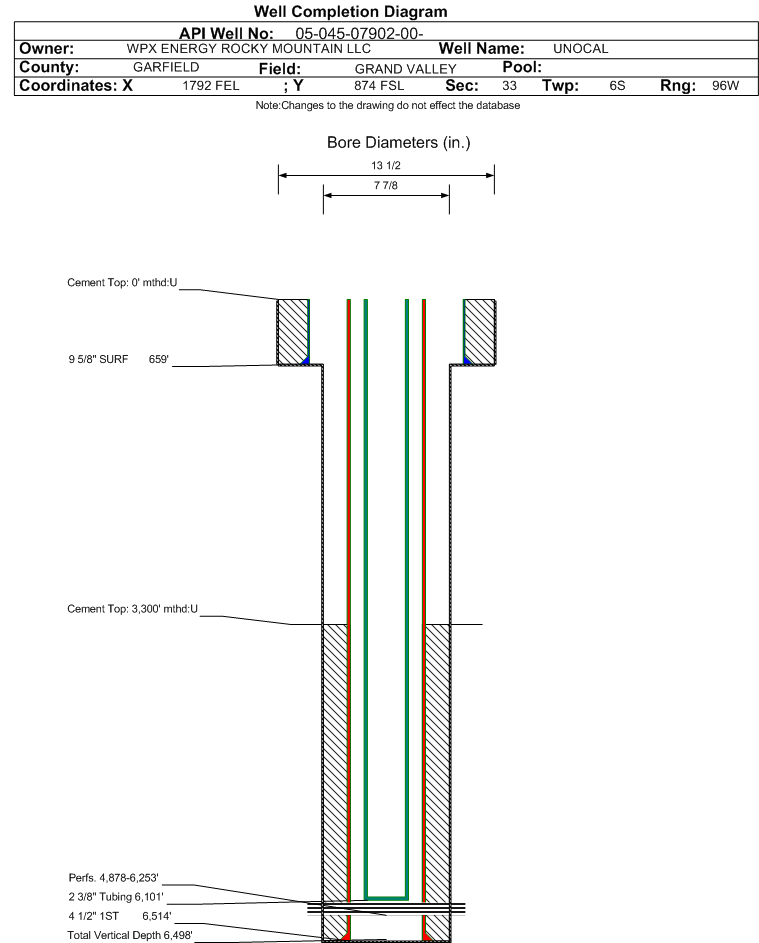 Wellbore #00 Wellbore Classification: GW Status: PR - 4/24/2002 Measured TD: 6530 ft. Vertical TD: 6498 ft.| Wellbore Data for Original Wellbore | Wellbore Classification: GW PR - 4/24/2002 | | Wellbore Permit | | | Permit #: | 011413 | Expiration Date: | 7/18/2002 | | Proposed Top PZ Location: | Sec:33 Twp: 6S 96W | Footage: 995 FSL 2271 FEL | | Bottom Hole Location: | Sec:33 Twp: 6S 96W | Footage: 999 FSL 2346 FEL | | Proposed Depth/Form: | 6560 ft. | | Surface Mineral Owner Same: | Yes | | Mineral Owner: | FEE | Surface Owner: | FEE | | Unit: | | Unit Number: | | | Formation And Spacing: | Code: WMFK , Formation: WILLIAMS FORK , Order: 139-37 , Unit Acreage: 160, Drill Unit: SE/4 |