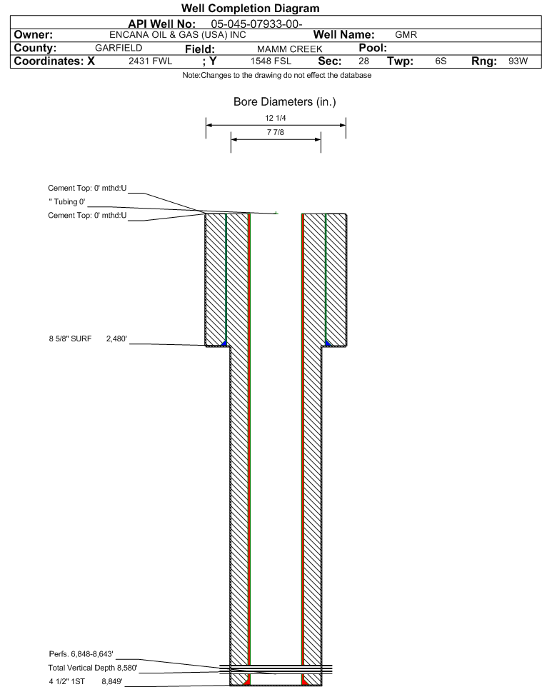 Formation WMFK Formation Classification: GW Status: PR - 5/1/2012 Interval Top: 6848 ft. Interval Bottom: 8643 ft.| Completed Information for Formation WILLIAMS FORK | | 1st Production Date: | N/A | Choke Size: | | | Formation Name: | WILLIAMS FORK | Commingled: | | | Production Method: | | | Open Hole Completion: | |