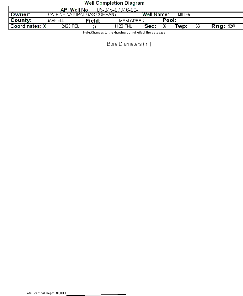 Wellbore #00 Wellbore Classification: Status: AL - 6/24/2003 Measured TD: | Wellbore Data for Original Wellbore | Wellbore Classification: AL - 6/24/2003 | | Wellbore Permit | | | Permit #: | 011754 | Expiration Date: | 9/24/2002 | | Proposed Top PZ Location: | Sec:36 Twp: 6S 92W | Footage: 1972 FNL 2004 FEL | | Bottom Hole Location: | Sec:36 Twp: 6S 92W | Footage: 1972 FNL 2004 FEL | | Proposed Depth/Form: | 5600 ft. | | Surface Mineral Owner Same: | No | | Mineral Owner: | FEE | Surface Owner: | FEE | | Unit: | | Unit Number: | | | Formation And Spacing: | Code: WMFK , Formation: WILLIAMS FORK , Order: 191-5 , Unit Acreage: 40, Drill Unit: SWNE | | Casing: | String Type: SURF, Hole Size: 12.25 in., Size: 9.625 in., Top: , Depth: 600 ft., Weight: 24 , Citings Type: PLANNED | | Cement: | Sacks: 300, Top: 0 ft., Bottom: 600 ft. | | Casing: | String Type: 1ST, Hole Size: 7.875 in., Size: 4.5 in., Top: , Depth: 5600 ft., Weight: 11.6 , Citings Type: PLANNED | | Cement: | Sacks: 1200, Top: 0 ft., Bottom: 5600 ft. |