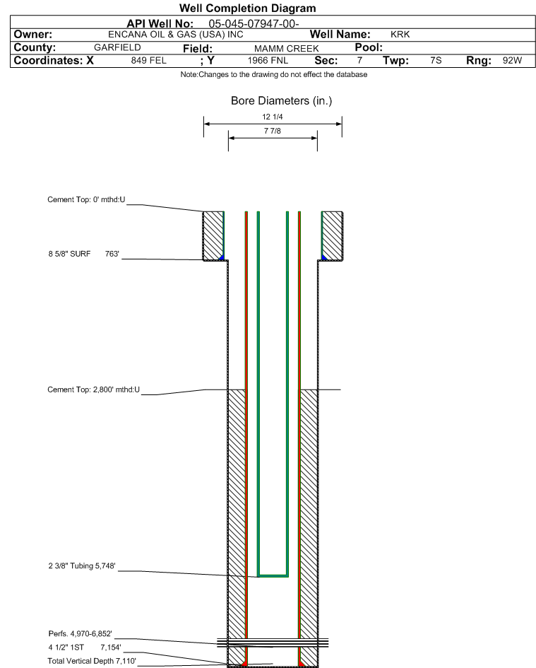 | Wellbore Completed | | Completion Date: | 6/26/2002 | | Spud Date: | 2/4/2002 | Spud Date Is: | ACTUAL | | Measured TD: | 7165 ft. | Measured PB depth: | | | True Vertical TD: | 7110 ft. | True Vertical PB depth: | 7086 ft. | | Top PZ Location: | Sec: Twp: | Footage: 2538 FNL 816 FEL | | Bottom Hole Location: | Sec: Twp: | Footage: 2498 FNL 689 FEL | | Log Types: | CBL / GR / CCL, RSL | | Casing: | String Type: SURF, Hole Size: 12.25 in., Size: 8.625 in., Top: 0 ft., Depth: 763 ft., Weight: 24 , Citings Type: ACTUAL | | Cement: | Sacks: 390, Top: 0 ft., Bottom: 763 ft., Determination Method: CALC | | Casing: | String Type: 1ST, Hole Size: 7.875 in., Size: 4.5 in., Top: 0 ft., Depth: 7154 ft., Weight: 11.6 , Citings Type: ACTUAL | | Cement: | Sacks: 1100, Top: 2800 ft., Bottom: 7154 ft., Determination Method: CBL | | Formation | Interval Top | Log Bottom | Cored | DSTs | | WASATCH | 0 ft. | 3624 ft. | N | N | | WILLIAMS FORK | 3625 ft. | 6750 ft. | N | N | | ROLLINS | 6751 ft. | 7165 ft. | N | N |