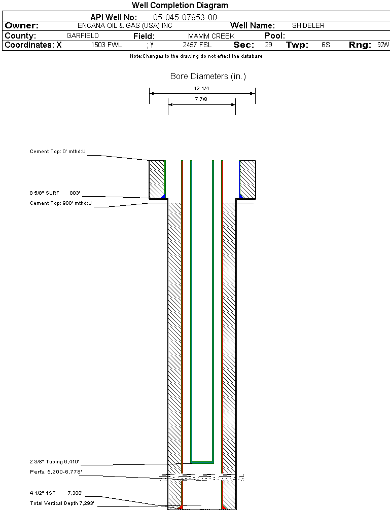 | Wellbore Completed | | Completion Date: | 3/8/2002 | | Spud Date: | 12/12/2001 | Spud Date Is: | ACTUAL | | Measured TD: | 7370 ft. | Measured PB depth: | | | True Vertical TD: | 7293 ft. | True Vertical PB depth: | 7304 ft. | | Top PZ Location: | Sec: Twp: | Footage: 1967 FSL 1984 FWL | | Bottom Hole Location: | Sec: Twp: | Footage: 1935 FSL 2001 FWL | | Log Types: | AI/LC/GR, CN/LD/GR, CBL/GR/CCL / TEMP | | Casing: | String Type: SURF, Hole Size: 12.25 in., Size: 8.625 in., Top: 0 ft., Depth: 803 ft., Weight: 24 , Citings Type: ACTUAL | | Cement: | Sacks: 545, Top: 0 ft., Bottom: 802 ft., Determination Method: CALC | | Casing: | String Type: 1ST, Hole Size: 7.875 in., Size: 4.5 in., Top: 0 ft., Depth: 7380 ft., Weight: 11.6 , Citings Type: ACTUAL | | Cement: | Sacks: 100, Top: 900 ft., Bottom: 7379 ft., Determination Method: CBL | | Formation | Interval Top | Log Bottom | Cored | DSTs | | WASATCH | 0 ft. | 3775 ft. | N | N | | WILLIAMS FORK | 3776 ft. | 6975 ft. | N | N | | ROLLINS | 6976 ft. | 7370 ft. | N | N |