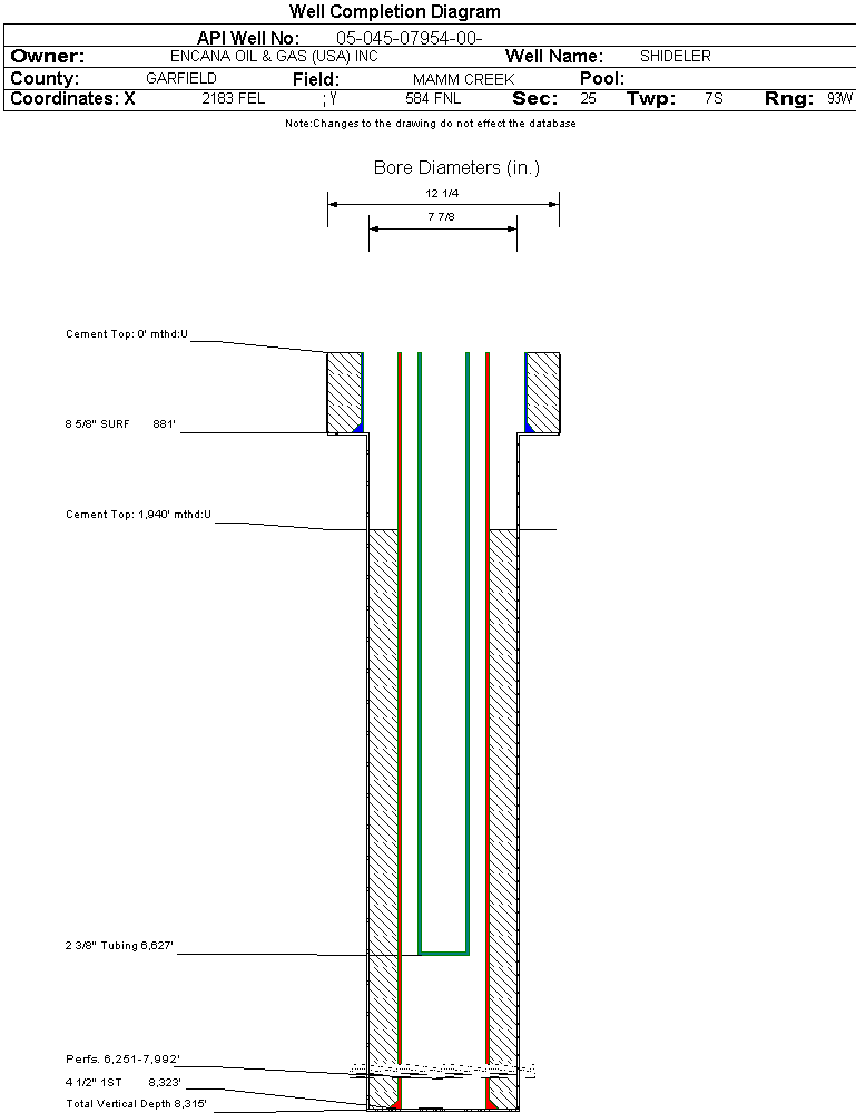 | Wellbore Completed | | Completion Date: | 5/31/2002 | | Spud Date: | 12/14/2001 | Spud Date Is: | ACTUAL | | Measured TD: | 8315 ft. | Measured PB depth: | 8278 ft. | | True Vertical TD: | | True Vertical PB depth: | | | Log Types: | CBL/GR/CCL,AI/LC/GR, CN/LD/GR | | Casing: | String Type: SURF, Hole Size: 12.25 in., Size: 8.625 in., Top: 0 ft., Depth: 881 ft., Weight: 24 , Citings Type: ACTUAL | | Cement: | Sacks: 360, Top: 0 ft., Bottom: 881 ft., Determination Method: CALC | | Casing: | String Type: 1ST, Hole Size: 7.875 in., Size: 4.5 in., Top: 0 ft., Depth: 8323 ft., Weight: 11.6 , Citings Type: ACTUAL | | Cement: | Sacks: 350, Top: 1940 ft., Bottom: 8323 ft., Determination Method: CBL | | Formation | Interval Top | Log Bottom | Cored | DSTs | | WASATCH | 0 ft. | 5137 ft. | N | N | | WILLIAMS FORK | 8138 ft. | 8229 ft. | N | N | | ROLLINS | 8230 ft. | 8315 ft. | N | N |