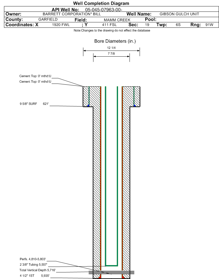 Wellbore #00 Wellbore Classification: GW Status: PR - 10/2/2001 Measured TD: 5935 ft. Vertical TD: 5716 ft.| Wellbore Data for Original Wellbore | Wellbore Classification: GW PR - 10/2/2001 | | Wellbore Permit | | | Permit #: | 011860 | Expiration Date: | 10/17/2002 | | Proposed Top PZ Location: | Sec:19 Twp: 6S 91W | Footage: 2220 FEL 660 FSL | | Bottom Hole Location: | Sec:19 Twp: 6S 91W | Footage: 2220 FEL 660 FSL | | Proposed Depth/Form: | 5700 ft. | | Surface Mineral Owner Same: | No | | Mineral Owner: | FEE | Surface Owner: | FEE | | Unit: | | Unit Number: | | | Formation And Spacing: | Code: WMFK , Formation: WILLIAMS FORK , Order: , Unit Acreage: , Drill Unit: |