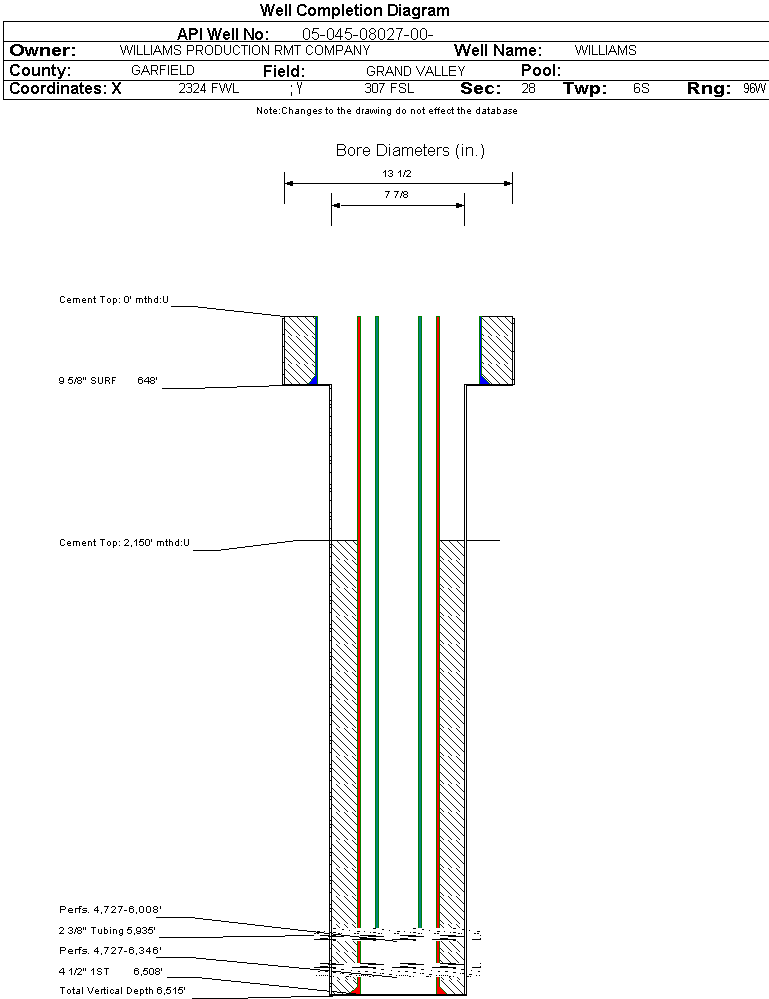 Wellbore #00 Wellbore Classification: CBM Status: PR - 11/27/2003 Measured TD: 6515 ft.| Wellbore Data for Original Wellbore | Wellbore Classification: CBM PR - 11/27/2003 | | Wellbore Permit | | | Permit #: | 20022177 | Expiration Date: | 12/5/2003 | | Proposed Depth/Form: | 6500 ft. | | Surface Mineral Owner Same: | No | | Mineral Owner: | FEE | Surface Owner: | FEE | | Unit: | | Unit Number: | | | Formation And Spacing: | Code: WMFK , Formation: WILLIAMS FORK , Order: 139-32 , Unit Acreage: 320, Drill Unit: W/2 |