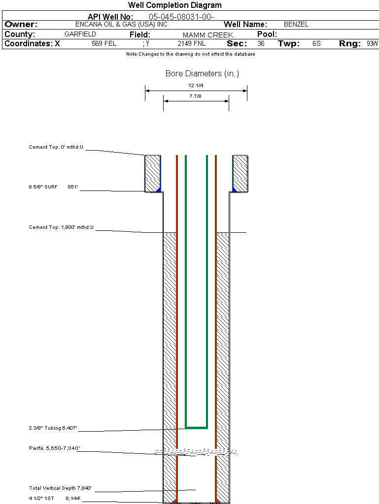 | Wellbore Completed | | Completion Date: | 8/15/2002 | | Spud Date: | 2/9/2002 | Spud Date Is: | ACTUAL | | Measured TD: | 8140 ft. | Measured PB depth: | | | True Vertical TD: | 7840 ft. | True Vertical PB depth: | 7852 ft. | | Top PZ Location: | Sec: Twp: | Footage: FL FL | | Bottom Hole Location: | Sec: Twp: | Footage: FL FL | | Log Types: | CBL / GR / CCL, AI / LC / GR, CN / LD / GR | | Casing: | String Type: SURF, Hole Size: 12.25 in., Size: 8.625 in., Top: 0 ft., Depth: 851 ft., Weight: 24 , Citings Type: ACTUAL | | Cement: | Sacks: 525, Top: 0 ft., Bottom: 851 ft., Determination Method: CALC | | Casing: | String Type: 1ST, Hole Size: 7.875 in., Size: 4.5 in., Top: 0 ft., Depth: 8144 ft., Weight: 11.6 , Citings Type: ACTUAL | | Cement: | Sacks: 1300, Top: 1800 ft., Bottom: 8144 ft., Determination Method: CBL | | Formation | Interval Top | Log Bottom | Cored | DSTs | | WASATCH | 0 ft. | 4465 ft. | N | N | | WILLIAMS FORK | 4466 ft. | 7633 ft. | N | N | | ROLLINS | 7634 ft. | 8140 ft. | N | N |