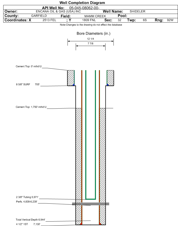 Wellbore #00 Wellbore Classification: GW Status: PR - 2/1/2025 Measured TD: 7130 ft. Vertical TD: 6944 ft.| Wellbore Data for Original Wellbore | Wellbore Classification: GW PR - 2/1/2025 | | Wellbore Permit | DIRECTIONAL | | Permit #: | 20020381 | Expiration Date: | 2/25/2003 | | Proposed Top PZ Location: | Sec:32 Twp: 6S 92W | Footage: 712 FNL 2606 FEL | | Bottom Hole Location: | Sec:32 Twp: 6S 92W | Footage: 670 FNL 2620 FWL | | Proposed Depth/Form: | 7500 ft. | | Surface Mineral Owner Same: | Yes | | Mineral Owner: | FEE | Surface Owner: | FEE | | Unit: | GRASS MESA UNIT | Unit Number: | COC 55279X | | Formation And Spacing: | Code: RLNS , Formation: ROLLINS , Order: , Unit Acreage: , Drill Unit: | | Formation And Spacing: | Code: WMFK , Formation: WILLIAMS FORK , Order: , Unit Acreage: , Drill Unit: |