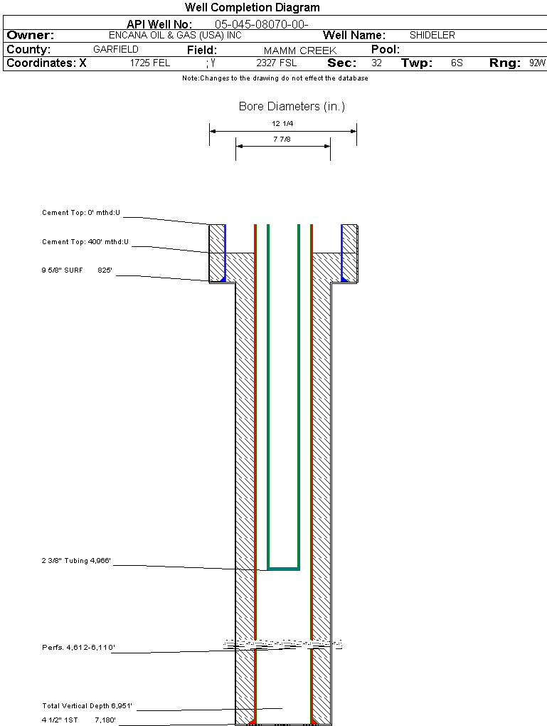 | Wellbore Completed | | Completion Date: | 9/18/2002 | | Spud Date: | 6/1/2002 | Spud Date Is: | ACTUAL | | Measured TD: | 7185 ft. | Measured PB depth: | | | True Vertical TD: | 6951 ft. | True Vertical PB depth: | 6827 ft. | | Top PZ Location: | Sec: Twp: | Footage: FL FL | | Bottom Hole Location: | Sec: Twp: | Footage: FL FL | | Log Types: | CBL / GR / CCL / TEMP, AI/LC/GR, CN/TLD/GR | | Casing: | String Type: SURF, Hole Size: 12.25 in., Size: 9.625 in., Top: 0 ft., Depth: 825 ft., Weight: 36 , Citings Type: ACTUAL | | Cement: | Sacks: 450, Top: 0 ft., Bottom: 825 ft., Determination Method: CALC | | Casing: | String Type: 1ST, Hole Size: 7.875 in., Size: 4.5 in., Top: 0 ft., Depth: 7180 ft., Weight: 11.6 , Citings Type: ACTUAL | | Cement: | Sacks: 1280, Top: 400 ft., Bottom: 7180 ft., Determination Method: CBL | | Formation | Interval Top | Log Bottom | Cored | DSTs | | WASATCH | 0 ft. | 3547 ft. | N | N | | WILLIAMS FORK | 3548 ft. | 6693 ft. | N | N | | ROLLINS | 6694 ft. | 7185 ft. | N | N |