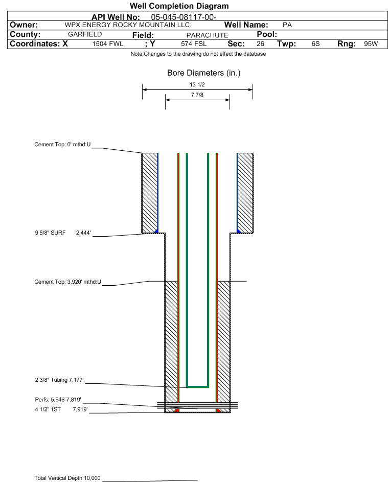 Wellbore #00 Wellbore Classification: GW Status: PR - 9/27/2002 Measured TD: 7921 ft.| Wellbore Data for Original Wellbore | Wellbore Classification: GW PR - 9/27/2002 | | Wellbore Permit | | | Permit #: | 20020692 | Expiration Date: | 4/15/2003 | | Proposed Depth/Form: | 7920 ft. | | Surface Mineral Owner Same: | Yes | | Mineral Owner: | FEE | Surface Owner: | FEE | | Unit: | | Unit Number: | | | Formation And Spacing: | Code: WMFK , Formation: WILLIAMS FORK , Order: 139-35 , Unit Acreage: 320, Drill Unit: W/2 | | Casing: | String Type: CONDUCTOR, Hole Size: , Size: 16 in., Top: , Depth: 45 ft., Weight: , Citings Type: PLANNED | | Cement: | Sacks: , Top: , Bottom: |