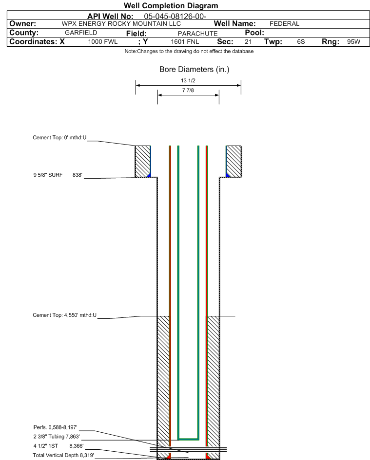 Wellbore #00 Wellbore Classification: GW Status: PR - 11/13/2002 Measured TD: 8383 ft. Vertical TD: 8319 ft.| Wellbore Data for Original Wellbore | Wellbore Classification: GW PR - 11/13/2002 | | Wellbore Permit | DIRECTIONAL | | Permit #: | 20020790 | Expiration Date: | 4/22/2003 | | Proposed Top PZ Location: | Sec:21 Twp: 6S 95W | Footage: 2101 FNL 459 FWL | | Bottom Hole Location: | Sec:21 Twp: 6S 95W | Footage: 2134 FNL 425 FWL | | Proposed Depth/Form: | 8460 ft. | | Surface Mineral Owner Same: | Yes | | Mineral Owner: | FEDERAL | Surface Owner: | FEDERAL | | Unit: | | Unit Number: | | | Formation And Spacing: | Code: WMFK , Formation: WILLIAMS FORK , Order: 139-35 , Unit Acreage: , Drill Unit: | | Casing: | String Type: CONDUCTOR, Hole Size: , Size: 16 in., Top: , Depth: 45 ft., Weight: , Citings Type: PLANNED | | Cement: | Sacks: , Top: , Bottom: |