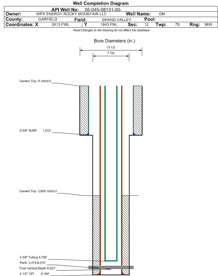 Wellbore #00 Wellbore Classification: GW Status: PR - 4/3/2002 Measured TD: 6204 ft. Vertical TD: 6023 ft.| Wellbore Data for Original Wellbore | Wellbore Classification: GW PR - 4/3/2002 | | Wellbore Permit | | | Permit #: | 20020691 | Expiration Date: | 5/1/2003 | | Proposed Top PZ Location: | Sec:12 Twp: 7S 96W | Footage: 2390 FNL 1739 FWL | | Bottom Hole Location: | Sec:12 Twp: 7S 96W | Footage: 2460 FNL 956 FWL | | Proposed Depth/Form: | 6169 ft. | | Surface Mineral Owner Same: | Yes | | Mineral Owner: | FEE | Surface Owner: | FEE | | Unit: | | Unit Number: | | | Formation And Spacing: | Code: WMFK , Formation: WILLIAMS FORK , Order: 440-19 , Unit Acreage: 320, Drill Unit: W/2 |