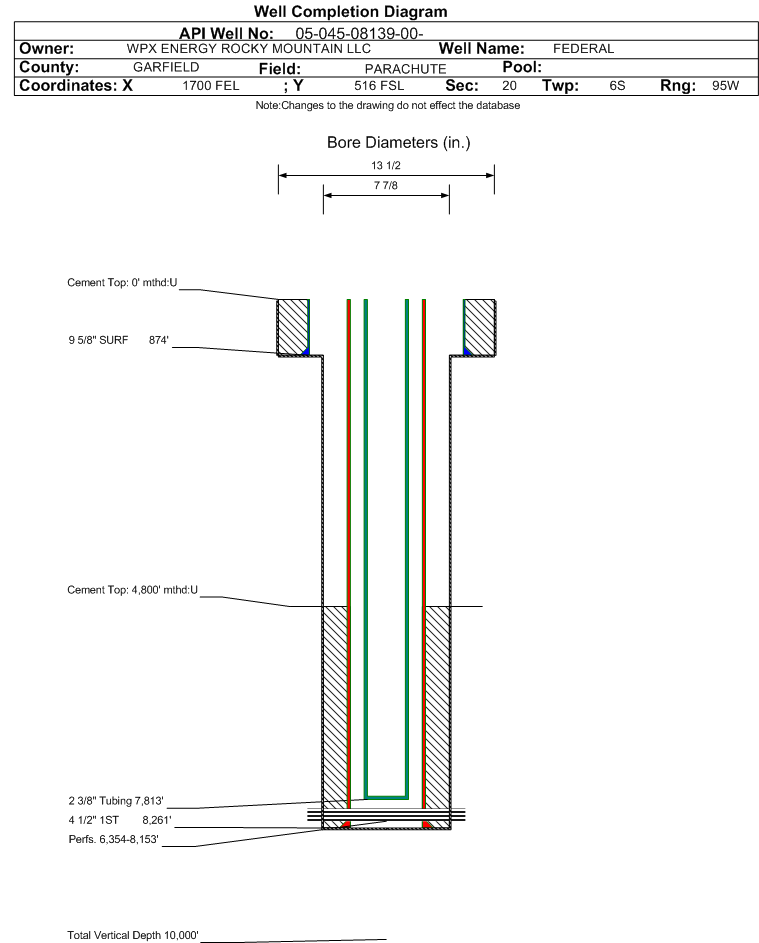 Wellbore #00 Wellbore Classification: GW Status: PR - 11/17/2002 Measured TD: 8269 ft.| Wellbore Data for Original Wellbore | Wellbore Classification: GW PR - 11/17/2002 | | Wellbore Permit | DIRECTIONAL | | Permit #: | 20020931 | Expiration Date: | 5/23/2003 | | Proposed Top PZ Location: | Sec:20 Twp: 6S 95W | Footage: 1010 FSL 2182 FEL | | Bottom Hole Location: | Sec:20 Twp: 6S 95W | Footage: 1030 FSL 2205 FEL | | Proposed Depth/Form: | 8340 ft. | | Surface Mineral Owner Same: | Yes | | Mineral Owner: | FEDERAL | Surface Owner: | FEDERAL | | Unit: | | Unit Number: | | | Formation And Spacing: | Code: WMFK , Formation: WILLIAMS FORK , Order: 139-35 , Unit Acreage: 320, Drill Unit: S/2 | | Casing: | String Type: CONDUCTOR, Hole Size: , Size: 16 in., Top: , Depth: 45 ft., Weight: , Citings Type: PLANNED | | Cement: | Sacks: , Top: , Bottom: |