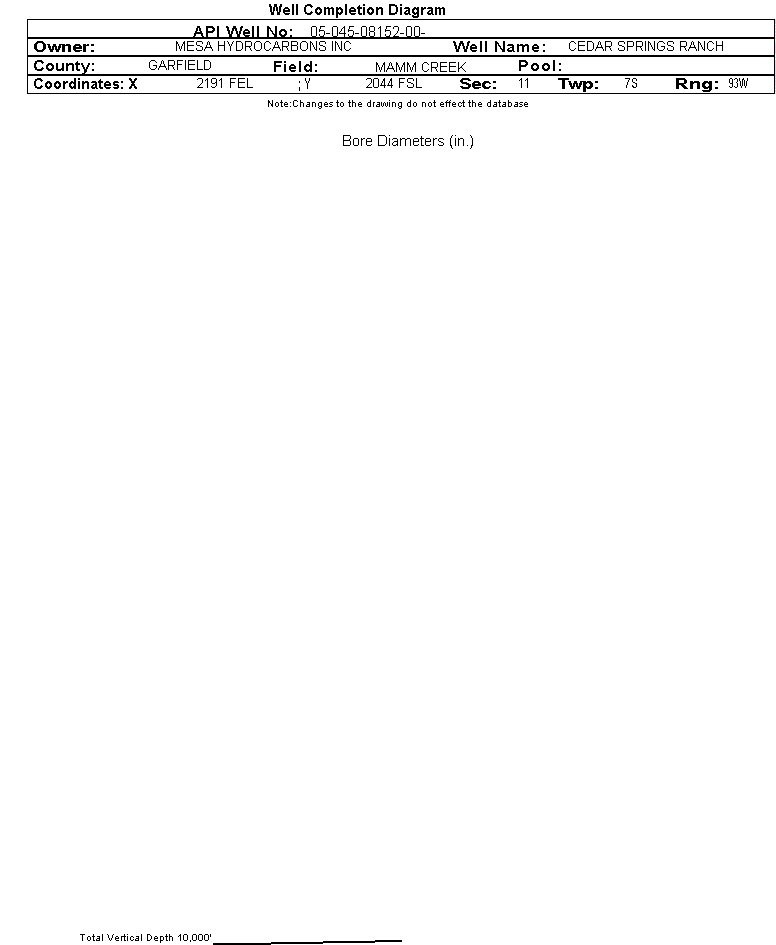 Wellbore #00 Wellbore Classification: Status: AL - 2/23/2004 Measured TD: | Wellbore Data for Original Wellbore | Wellbore Classification: AL - 2/23/2004 | | Wellbore Permit | DIRECTIONAL | | Permit #: | 20020887 | Expiration Date: | 6/5/2003 | | Proposed Top PZ Location: | Sec:11 Twp: 7S 93W | Footage: 2636 FSL 2593 FWL | | Bottom Hole Location: | Sec:11 Twp: 7S 93W | Footage: 2636 FSL 2593 FWL | | Proposed Depth/Form: | 7810 ft. | | Surface Mineral Owner Same: | Yes | | Mineral Owner: | FEE | Surface Owner: | FEE | | Unit: | | Unit Number: | | | Formation And Spacing: | Code: WMFK , Formation: WILLIAMS FORK , Order: , Unit Acreage: , Drill Unit: | | Casing: | String Type: SURF, Hole Size: 12.25 in., Size: 9.625 in., Top: , Depth: 1000 ft., Weight: 36 , Citings Type: PLANNED | | Cement: | Sacks: 450, Top: 0 ft., Bottom: 1000 ft. | | Casing: | String Type: 1ST, Hole Size: 7.875 in., Size: 4.5 in., Top: , Depth: 7875 ft., Weight: 11.6 , Citings Type: PLANNED | | Cement: | Sacks: 2200, Top: 3500 ft., Bottom: 7875 ft. |