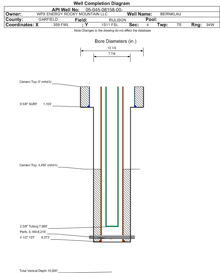 Wellbore #00 Wellbore Classification: GW Status: PR - 12/26/2002 Measured TD: 8386 ft.| Wellbore Data for Original Wellbore | Wellbore Classification: GW PR - 12/26/2002 | | Wellbore Permit | DIRECTIONAL | | Permit #: | 20021120 | Expiration Date: | 6/5/2003 | | Proposed Top PZ Location: | Sec:4 Twp: 7S 94W | Footage: 2053 FSL 508 FWL | | Bottom Hole Location: | Sec:4 Twp: 7S 94W | Footage: 2070 FSL 520 FWL | | Proposed Depth/Form: | 8220 ft. | | Surface Mineral Owner Same: | Yes | | Mineral Owner: | FEE | Surface Owner: | FEE | | Unit: | | Unit Number: | | | Formation And Spacing: | Code: WMFK , Formation: WILLIAMS FORK , Order: 479-7 , Unit Acreage: 640, Drill Unit: ALL |