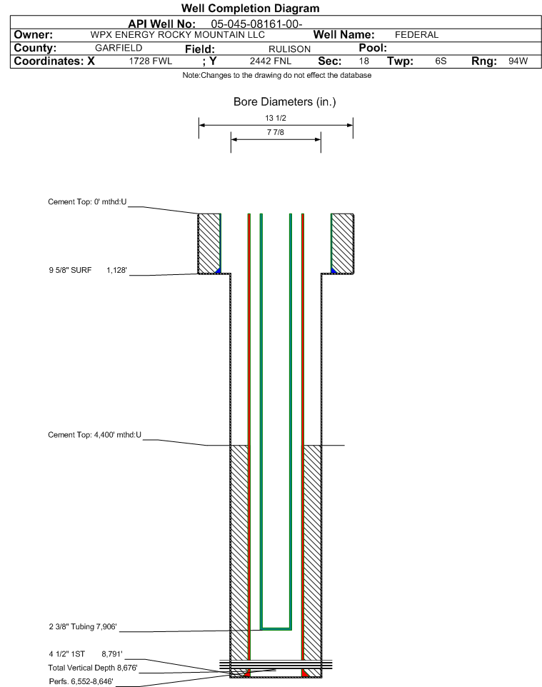 Wellbore #00 Wellbore Classification: GW Status: PR - 12/13/2002 Measured TD: 8801 ft. Vertical TD: 8676 ft.| Wellbore Data for Original Wellbore | Wellbore Classification: GW PR - 12/13/2002 | | Wellbore Permit | | | Permit #: | 20021113 | Expiration Date: | 6/9/2003 | | Proposed Top PZ Location: | Sec:18 Twp: 6S 94W | Footage: 1707 FSL 1533 FWL | | Bottom Hole Location: | Sec:18 Twp: 6S 94W | Footage: 1663 FSL 1527 FWL | | Proposed Depth/Form: | 8695 ft. | | Surface Mineral Owner Same: | Yes | | Mineral Owner: | FEDERAL | Surface Owner: | FEDERAL | | Unit: | | Unit Number: | | | Formation And Spacing: | Code: WMFK , Formation: WILLIAMS FORK , Order: 139-35 , Unit Acreage: 320, Drill Unit: S/2 |