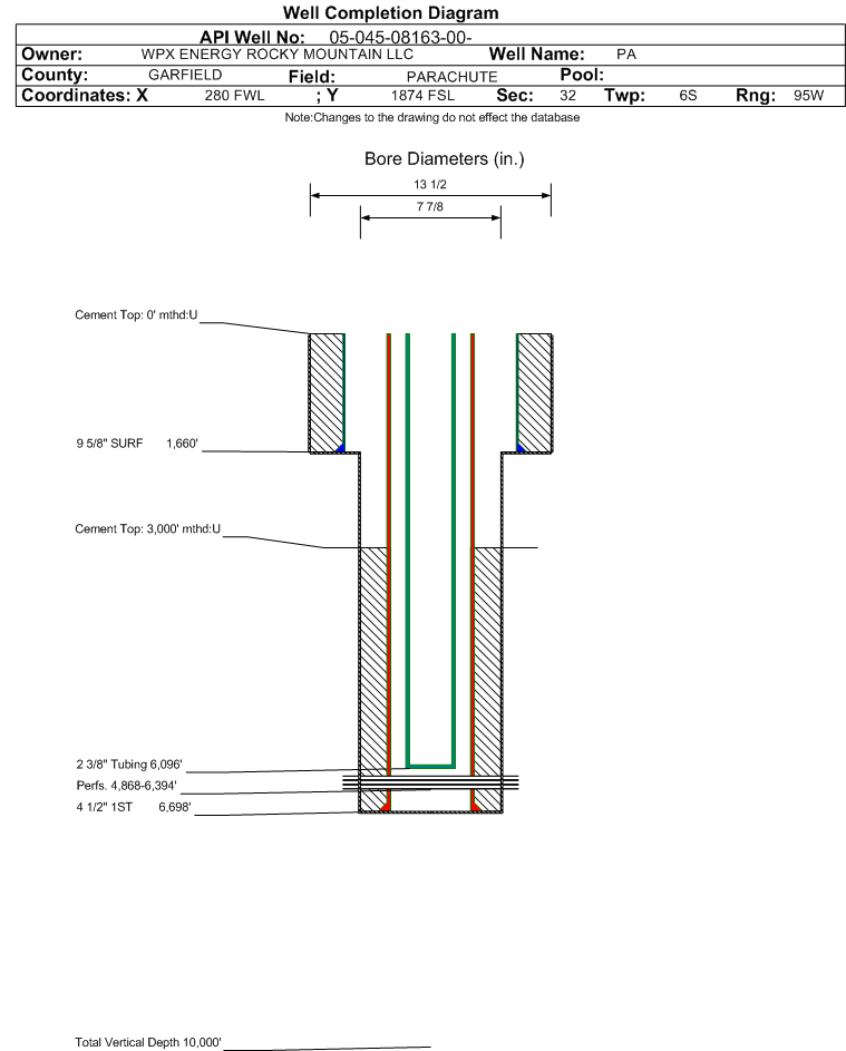 Wellbore #00 Wellbore Classification: OW Status: PR - 8/23/2002 Measured TD: 6710 ft.| Wellbore Data for Original Wellbore | Wellbore Classification: OW PR - 8/23/2002 | | Wellbore Permit | | | Permit #: | 20021108 | Expiration Date: | 6/9/2003 | | Proposed Depth/Form: | 6740 ft. | | Surface Mineral Owner Same: | Yes | | Mineral Owner: | FEE | Surface Owner: | FEE | | Unit: | | Unit Number: | | | Formation And Spacing: | Code: WMFK , Formation: WILLIAMS FORK , Order: 440-19 , Unit Acreage: 320, Drill Unit: W/2 |