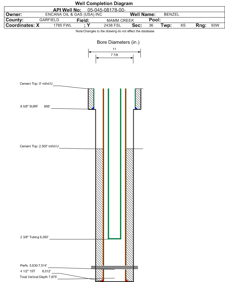Formation WMFK Formation Classification: GW Status: AB - 9/8/2022 Interval Top: 5630 ft. Interval Bottom: 7514 ft.| Completed Information for Formation WILLIAMS FORK | | 1st Production Date: | N/A | Choke Size: | 0.375 in. | | Formation Name: | WILLIAMS FORK | Commingled: | No | | Production Method: | | | Open Hole Completion: | No |