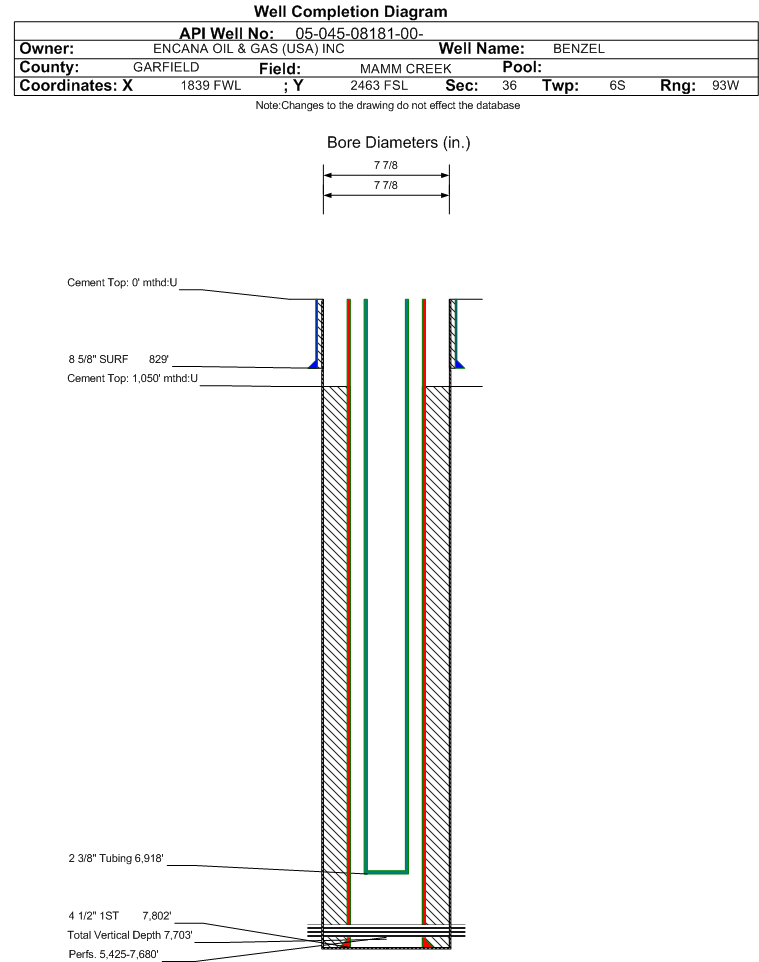 | Wellbore Completed | | Completion Date: | 3/30/2003 | | Spud Date: | 2/2/2003 | Spud Date Is: | ACTUAL | | Measured TD: | 7802 ft. | Measured PB depth: | | | True Vertical TD: | 7703 ft. | True Vertical PB depth: | 7752 ft. | | Top PZ Location: | Sec: Twp: | Footage: FL FL | | Bottom Hole Location: | Sec: Twp: | Footage: FL FL | | Log Types: | AI/LC/GR, CN/TLD/GR, CBL/GR/CCL/TEMP | | Casing: | String Type: SURF, Hole Size: 7.875 in., Size: 8.625 in., Top: 0 ft., Depth: 829 ft., Weight: 24 , Citings Type: ACTUAL | | Cement: | Sacks: 450, Top: 0 ft., Bottom: 829 ft., Determination Method: CALC | | Casing: | String Type: 1ST, Hole Size: 7.875 in., Size: 4.5 in., Top: 0 ft., Depth: 7802 ft., Weight: 11.6 , Citings Type: ACTUAL | | Cement: | Sacks: 1140, Top: 1050 ft., Bottom: 7802 ft., Determination Method: CBL | | Formation | Interval Top | Log Bottom | Cored | DSTs | | WASATCH | 0 ft. | 4600 ft. | N | N | | WILLIAMS FORK | 4601 ft. | 7581 ft. | N | N | | ROLLINS | 7582 ft. | 7802 ft. | N | N |