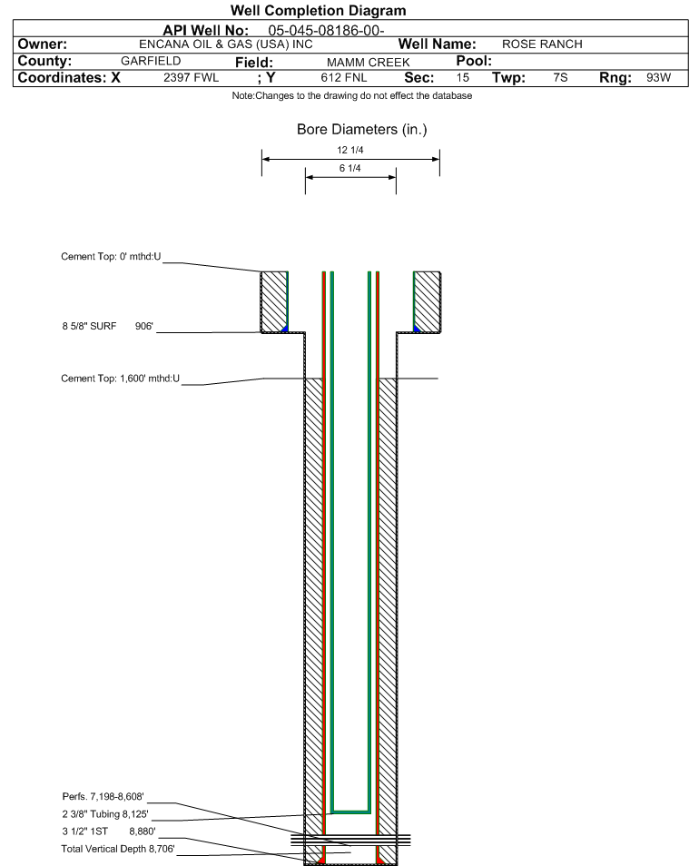 | Wellbore Completed | | Completion Date: | 4/28/2003 | | Spud Date: | 12/31/2002 | Spud Date Is: | ACTUAL | | Measured TD: | 8881 ft. | Measured PB depth: | 0 ft. | | True Vertical TD: | 8706 ft. | True Vertical PB depth: | 8742 ft. | | Top PZ Location: | Sec:15 Twp: 7S 93W | Footage: 16 FNL 1370 FWL | | Bottom Hole Location: | Sec:15 Twp: 7S 93W | Footage: 10 FNL 1323 FWL | | Log Types: | CBL/GR/CCL/CM, RSL | | Log Types: | | | Casing: | String Type: SURF, Hole Size: 12.25 in., Size: 8.625 in., Top: 0 ft., Depth: 906 ft., Weight: 24 , Citings Type: ACTUAL | | Cement: | Sacks: 460, Top: 0 ft., Bottom: 906 ft., Determination Method: CBL | | Casing: | String Type: 1ST, Hole Size: 6.25 in., Size: 3.5 in., Top: 0 ft., Depth: 8880 ft., Weight: 9.3 , Citings Type: ACTUAL | | Cement: | Sacks: 865, Top: 1600 ft., Bottom: 8880 ft., Determination Method: CALC | | Formation | Interval Top | Log Bottom | Cored | DSTs | | WASATCH | 0 ft. | 5998 ft. | N | N | | WILLIAMS FORK | 5999 ft. | 8881 ft. | N | N |