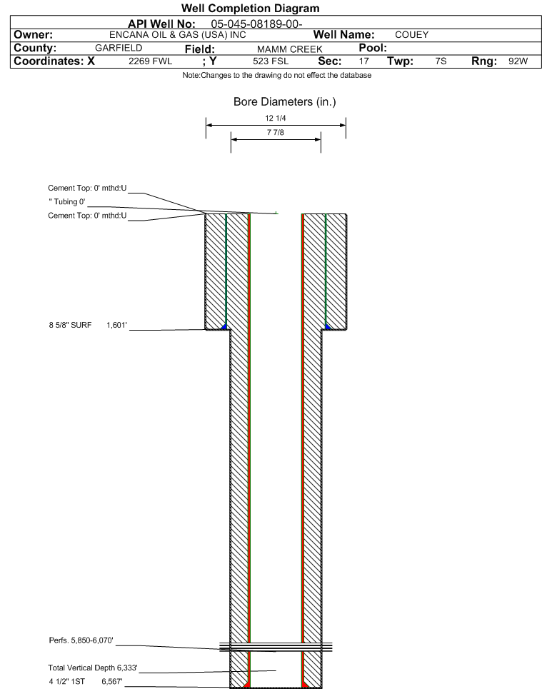 | | Perforation Data: | | Interval Top: | 5850 ft. | # Of Holes: | 42 | | Interval Bottom: | 6070 ft. | Hole Size: | |
