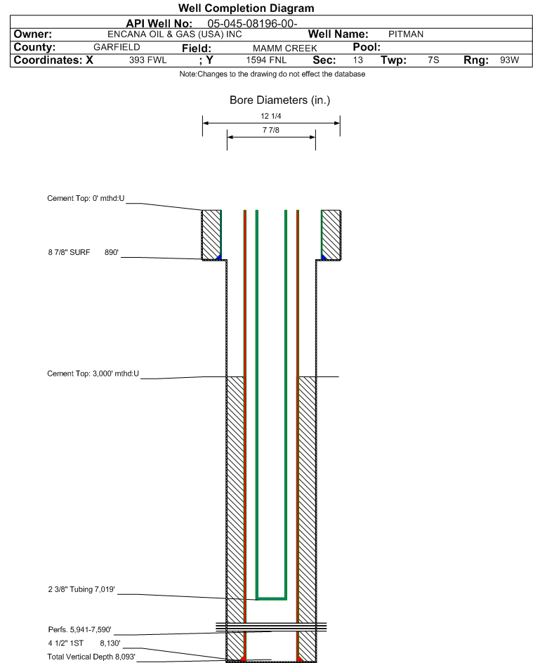 | Wellbore Completed | | Completion Date: | 9/9/2003 | | Spud Date: | 6/7/2003 | Spud Date Is: | ACTUAL | | Measured TD: | 8130 ft. | Measured PB depth: | 8068 ft. | | True Vertical TD: | 8093 ft. | True Vertical PB depth: | | | Top PZ Location: | Sec:13 Twp: 7S 93W | Footage: 1961 FNL 801 FWL | | Bottom Hole Location: | Sec:13 Twp: 7S 93W | Footage: 1975 FNL 800 FWL | | Log Types: | CBL/VD/GR/CCL, RSL/SM/GR/CCL | | Casing: | String Type: SURF, Hole Size: 12.25 in., Size: 8.875 in., Top: 0 ft., Depth: 890 ft., Weight: 24 , Citings Type: ACTUAL | | Cement: | Sacks: 450, Top: 0 ft., Bottom: 890 ft., Determination Method: CALC | | Casing: | String Type: 1ST, Hole Size: 7.875 in., Size: 4.5 in., Top: 0 ft., Depth: 8130 ft., Weight: 11.6 , Citings Type: ACTUAL | | Cement: | Sacks: 1345, Top: 3000 ft., Bottom: 8130 ft., Determination Method: CBL | | Formation | Interval Top | Log Bottom | Cored | DSTs | | WASATCH | 0 ft. | 4702 ft. | N | N | | WILLIAMS FORK | 4703 ft. | 7784 ft. | N | N | | ROLLINS | 7784 ft. | 8130 ft. | N | N |