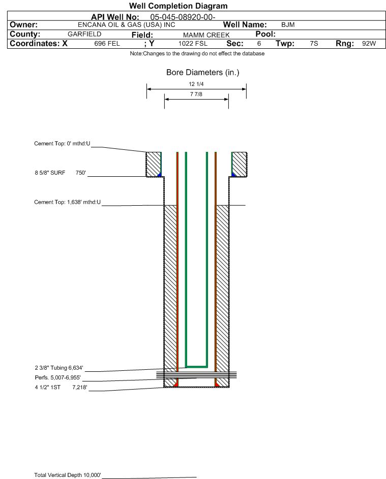 | | Perforation Data: | | Interval Top: | 5007 ft. | # Of Holes: | 98 | | Interval Bottom: | 6955 ft. | Hole Size: | |