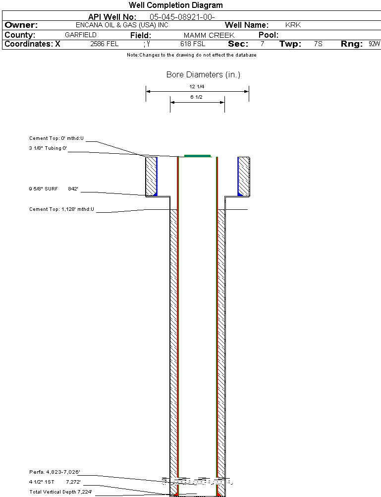 | Wellbore Completed | | Completion Date: | 1/29/2003 | | Spud Date: | 9/10/2003 | Spud Date Is: | ACTUAL | | Measured TD: | 7280 ft. | Measured PB depth: | | | True Vertical TD: | 7224 ft. | True Vertical PB depth: | 7182 ft. | | Top PZ Location: | Sec:7 Twp: 7S 92W | Footage: 630 FSL 2089 FEL | | Bottom Hole Location: | Sec:7 Twp: 7S 92W | Footage: 630 FSL 2025 FEL | | Log Types: | CBL/GR/CCL/TEMP, AI/LC/GR, CN/TLD/GR | | Casing: | String Type: SURF, Hole Size: 12.25 in., Size: 9.625 in., Top: 0 ft., Depth: 842 ft., Weight: 36 , Citings Type: ACTUAL | | Cement: | Sacks: 320, Top: 0 ft., Bottom: 842 ft., Determination Method: CALC | | Casing: | String Type: 1ST, Hole Size: 6.5 in., Size: 4.5 in., Top: 0 ft., Depth: 7272 ft., Weight: 11.6 , Citings Type: ACTUAL | | Cement: | Sacks: 1145, Top: 1128 ft., Bottom: 7272 ft., Determination Method: CBL | | Formation | Interval Top | Log Bottom | Cored | DSTs | | WASATCH | 0 ft. | 3834 ft. | N | N | | WILLIAMS FORK | 3835 ft. | 6960 ft. | N | N | | ROLLINS | 6961 ft. | 7280 ft. | N | N |