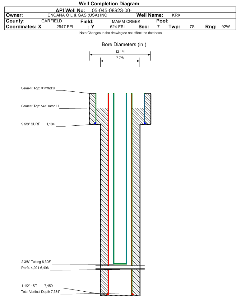 | Wellbore Completed | | Completion Date: | 2/19/2003 | | Spud Date: | 10/10/2002 | Spud Date Is: | ACTUAL | | Measured TD: | 7450 ft. | Measured PB depth: | | | True Vertical TD: | 7364 ft. | True Vertical PB depth: | 7408 ft. | | Top PZ Location: | Sec:7 Twp: 7S 92W | Footage: 761 FSL 3267 FEL | | Bottom Hole Location: | Sec:7 Twp: 7S 92W | Footage: 790 FSL 3300 FEL | | Log Types: | CBL/GR/CCL/TEMP, AI/LC/GR, CN/TLD/GR | | Casing: | String Type: SURF, Hole Size: 12.25 in., Size: 9.625 in., Top: , Depth: 1134 ft., Weight: 36 , Citings Type: ACTUAL | | Cement: | Sacks: 400, Top: , Bottom: 1140 ft., Determination Method: CALC | | Casing: | String Type: 1ST, Hole Size: 7.875 in., Size: 4.5 in., Top: , Depth: 7450 ft., Weight: 11.6 , Citings Type: ACTUAL | | Cement: | Sacks: 1370, Top: 541 ft., Bottom: 7450 ft., Determination Method: CBL | | Formation | Interval Top | Log Bottom | Cored | DSTs | | WASATCH | 0 ft. | 3976 ft. | N | N | | WILLIAMS FORK | 3977 ft. | 7116 ft. | N | N | | ROLLINS | 7117 ft. | 7450 ft. | N | N |