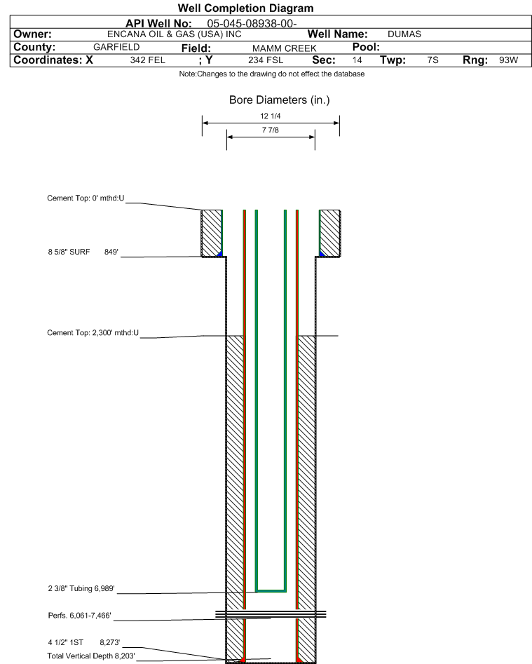 | Wellbore Completed | | Completion Date: | 5/16/2003 | | Spud Date: | 12/21/2002 | Spud Date Is: | ACTUAL | | Measured TD: | 8250 ft. | Measured PB depth: | 8180 ft. | | True Vertical TD: | 8203 ft. | True Vertical PB depth: | 0 ft. | | Top PZ Location: | Sec: Twp: | Footage: 13 FSL 10 FEL | | Bottom Hole Location: | Sec: Twp: | Footage: 10 FSL 10 FEL | | Log Types: | SCBL/VD/GR/CCL, AI/LC/GR, CN/TLD/GR | | Casing: | String Type: SURF, Hole Size: 12.25 in., Size: 8.625 in., Top: 0 ft., Depth: 849 ft., Weight: 24 , Citings Type: ACTUAL | | Cement: | Sacks: 450, Top: 0 ft., Bottom: 849 ft., Determination Method: CALC | | Casing: | String Type: 1ST, Hole Size: 7.875 in., Size: 4.5 in., Top: 0 ft., Depth: 8273 ft., Weight: 11.6 , Citings Type: ACTUAL | | Cement: | Sacks: 1620, Top: 2300 ft., Bottom: 8274 ft., Determination Method: CBL | | Formation | Interval Top | Log Bottom | Cored | DSTs | | WASATCH | 0 ft. | 4908 ft. | N | N | | WILLIAMS FORK | 4909 ft. | 7961 ft. | N | N | | ROLLINS | 7962 ft. | 8250 ft. | N | N |